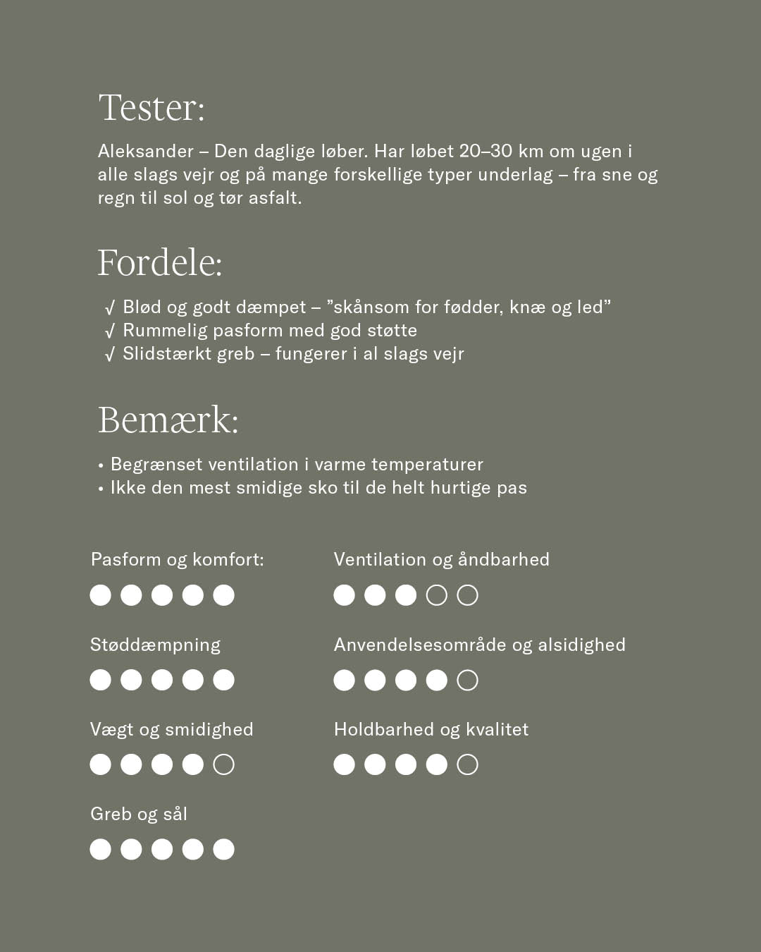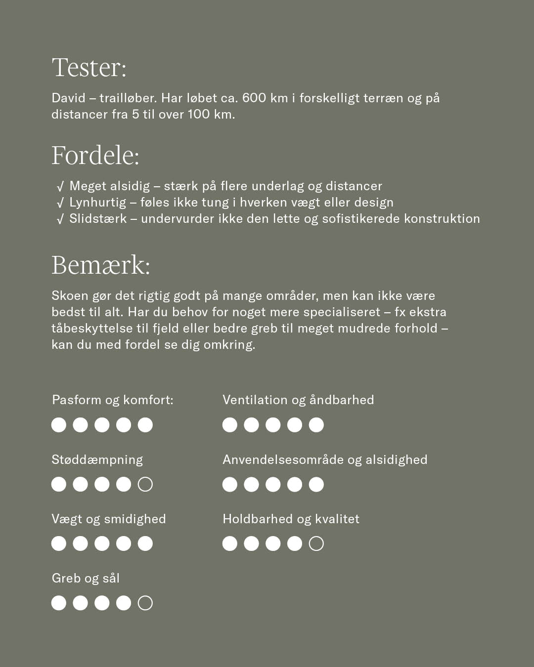 "Den lidt bredere pasform sammen med en responsiv fornemmelse, der varer hele løbet, gør denne sko til en trofast makker – især til lange ture."