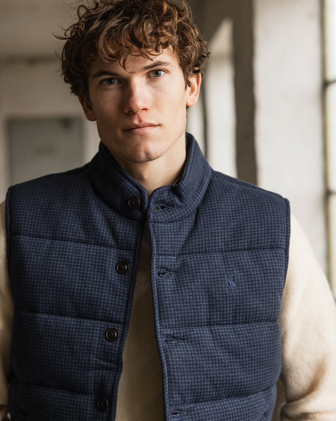 Denne houndstooth-mønstrede dunvest fra Polo Ralph Lauren tilfører både varme og tekstur. Bær den over en finstrikket trøje, sammen med chinos eller mørke jeans og et par brune loafers. Perfekt til tidlig forår, når morgenerne stadig er sprøde.