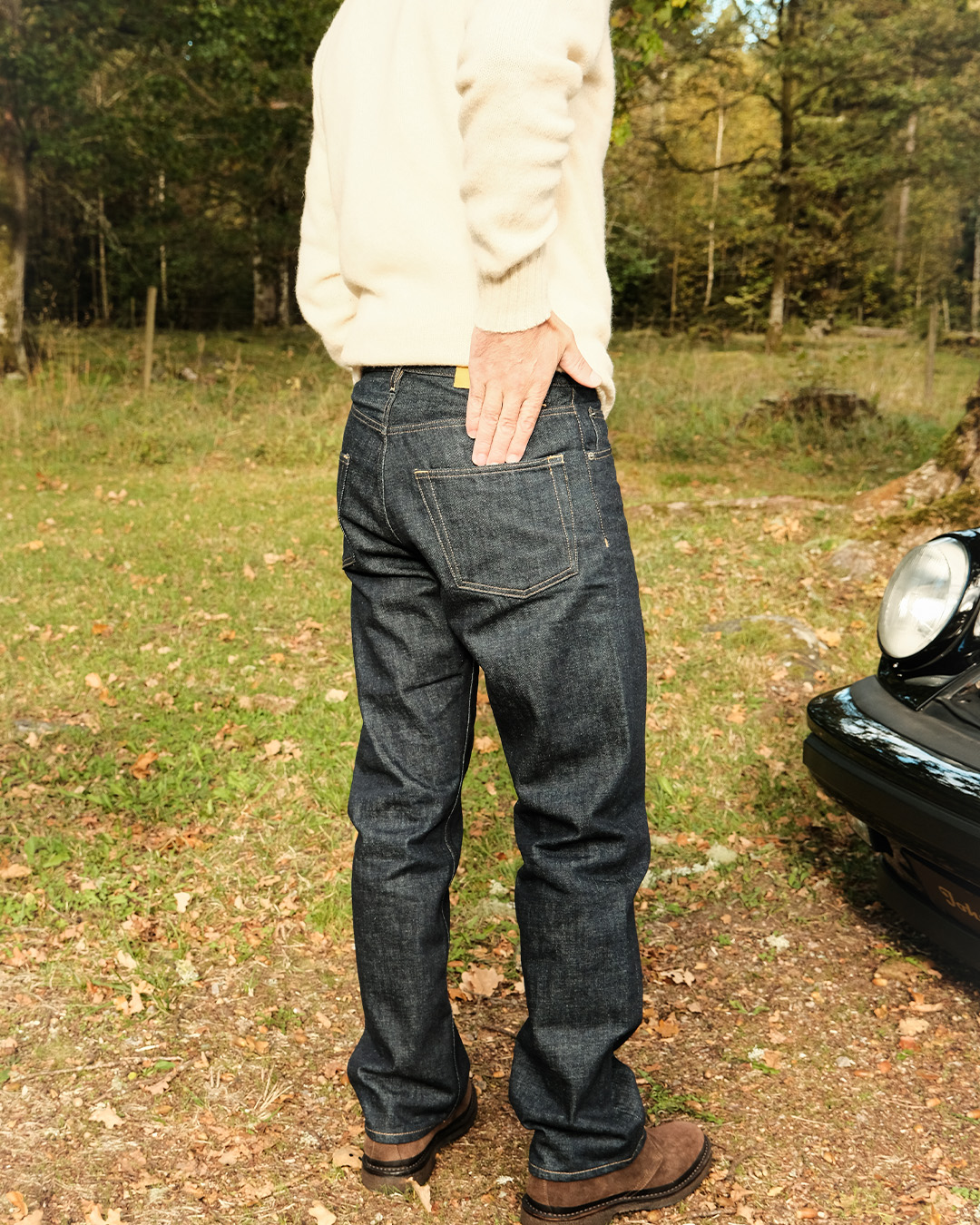 Modellen er klassiske femlommejeans i mørk vask, med knaplukning og en mockapatch bagpå. Silhuetten er lige og enkel, hvilket gør jeansene lette at bære både til blazer og skjorte eller mere afslappet sammen med strik og t-shirt. En af nøglelookene for vores del er i kombination med den V-halsede trøje fra Harley of Scotland og sorte loafers fra Myrqvist x Tärnsjö Garveri.