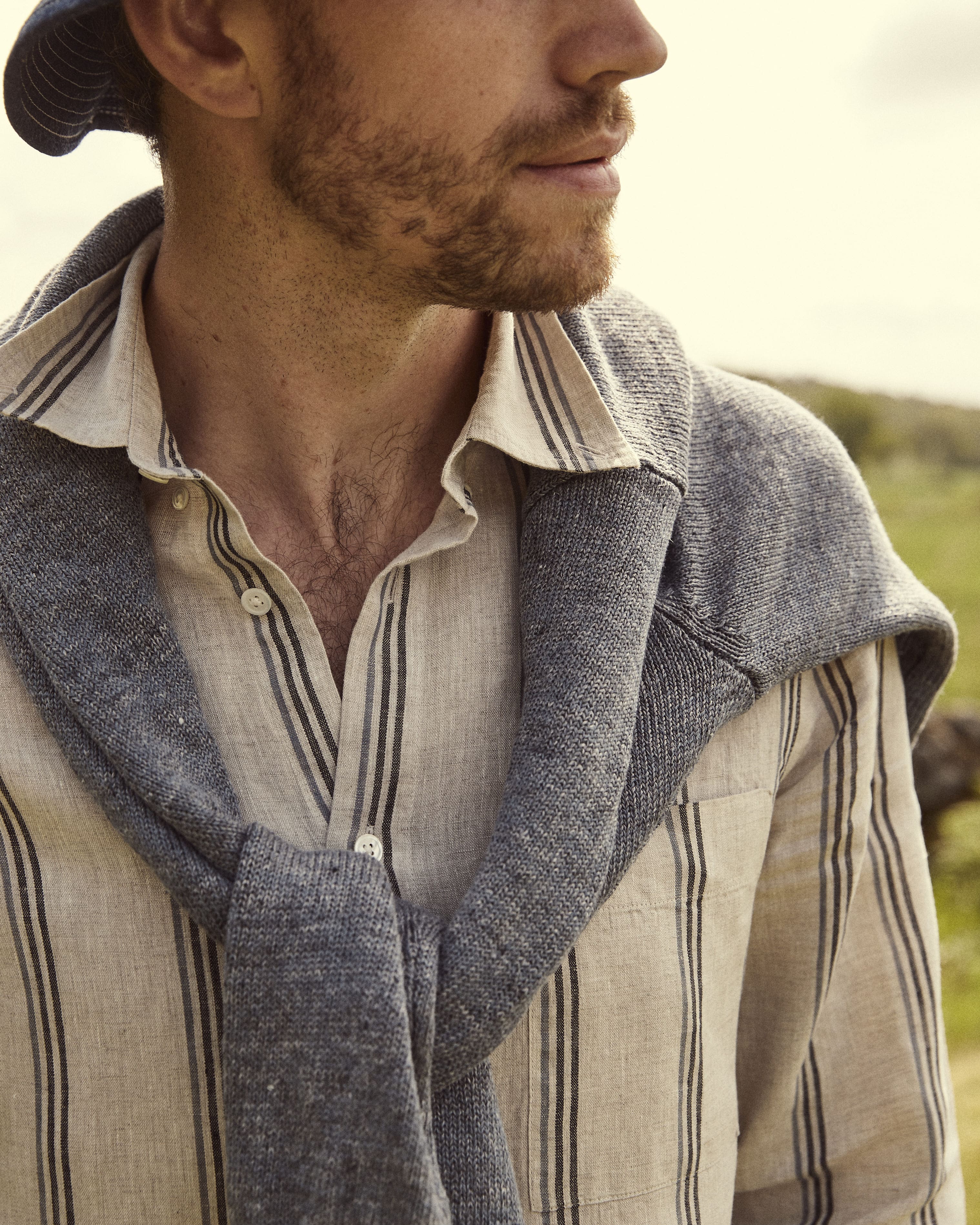 If you want to add a twist to your linen shirt choice, choosing striped models over solid colors is always nice. These stand out just enough, without being overpowering. With a pair of solid-colored linen trousers and midnight blue canvas sneakers, you have a look that works for lunch and hanging out in the park. Ireland’s Inis Meain sweater is a great addition to chilly summer evenings. The blue tones in this look are subtle throughout, despite the stripes on the shirt.